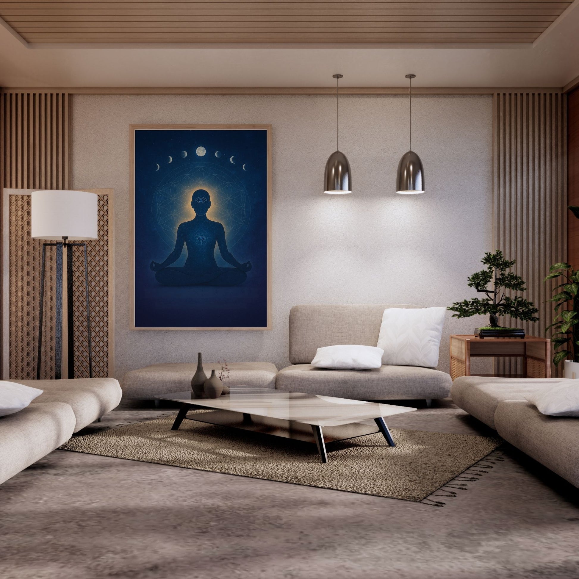 Plus de concentration, moins de bruit. « Silence Cosmique » associe les phases de la lune, le troisième œil et la géométrie sacrée dans un bleu nuit apaisant. Parfait pour les coins yoga, les chambres et les salles de méditation, et pour agrémenter avec élégance un bureau à domicile.