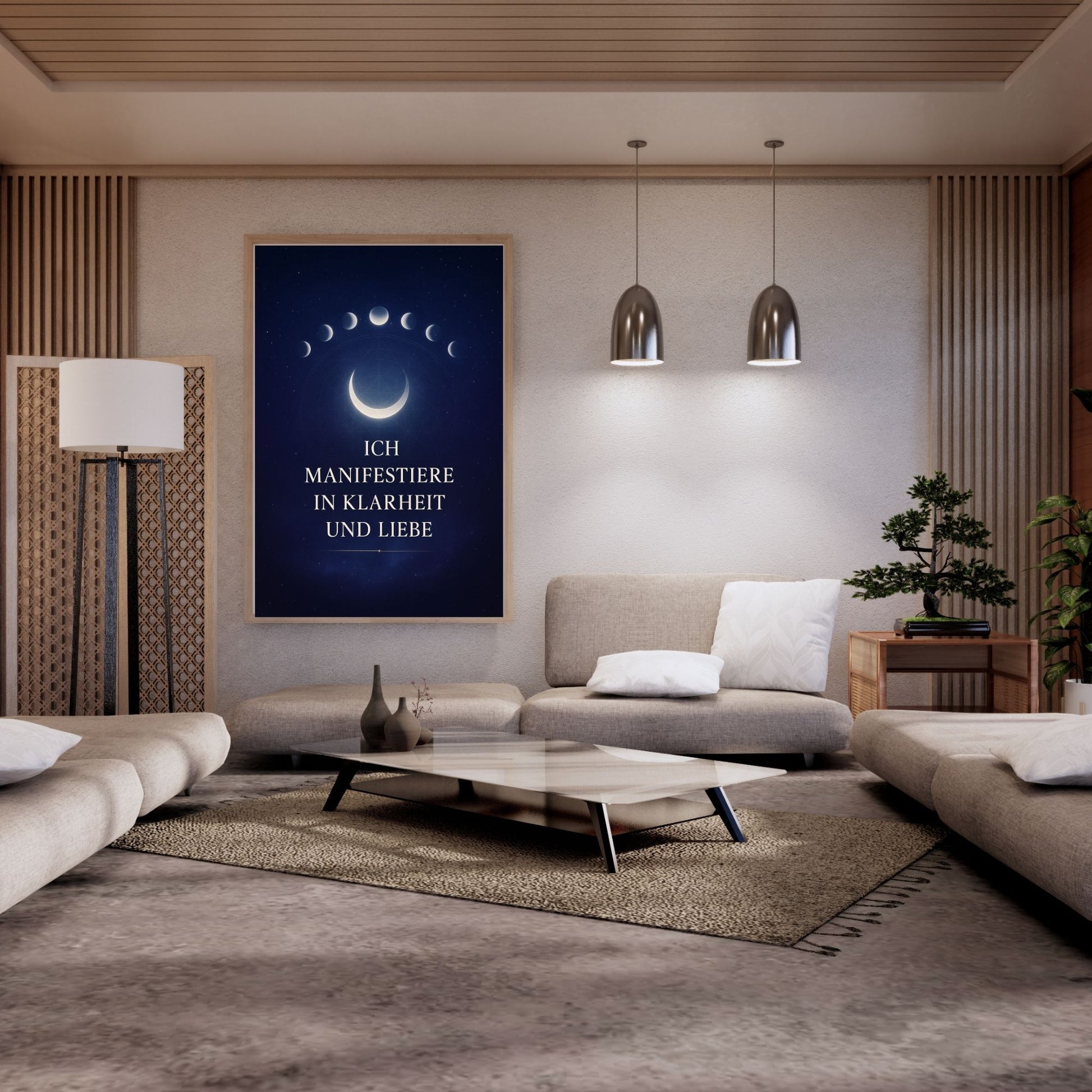 Plus de calme, plus de concentration, plus de vous-même . Cette affiche d'affirmation numérique associe un croissant de lune vibrant et des phases lunaires à la phrase « Je manifeste avec clarté et amour ». Idéale pour les coins yoga, les chambres, les bureaux à domicile ou les espaces de pratique, elle est moderne, bohème et intemporelle.